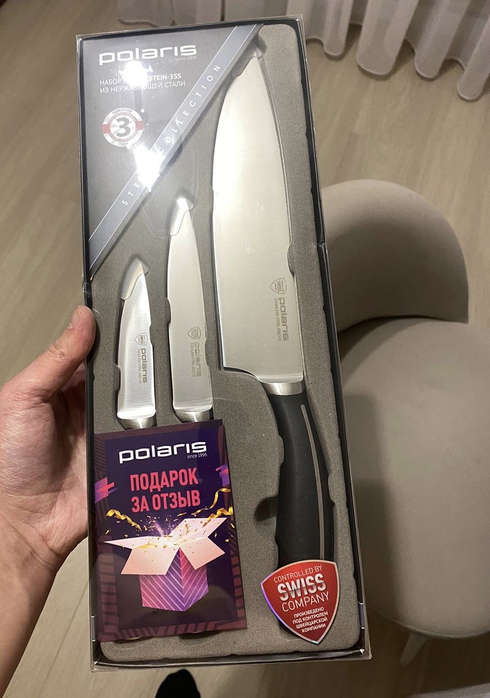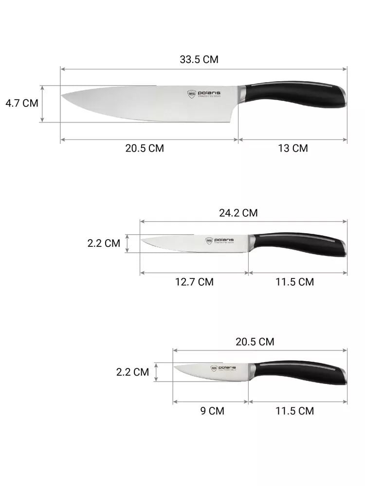 Твердость ножей по шкале Роквелла составляет 54±2 HRC, что гарантирует их высокую сопротивляемость деформации. Кроме того, форма рукоятки ножей специально разработана с учетом эргономики, чтобы предоставить вам максимальный комфорт во время работы на кухне. Все лезвия ножей Polaris тестируются на отсутствие дефектов, чтобы убедиться в соблюдении технологий при изготовлении. Для сохранения этих особенностей, мы не рекомендуем мыть ножи из нержавеющей стали в посудомоечной машине.