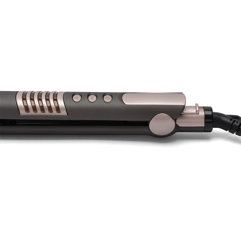 Благодаря прорезиненному мягкому покрытию стайлер приятно и удобно ложится в руку и не норовит выскользнуть во время использования. Шнур способен вращаться на 360 градусов, что предотвращает его перекручивание и запутывание. Наличие специальной петельки дает возможность повесить плойку в любом удобном месте.